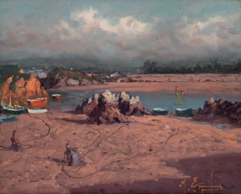 (Amorebieta, Vizcaya 1934) "Playa con personajes. Cantabria." Firmado: M. Eguiluz Óleo / Lienzo 22 x 27 cm.; 32 x 37 cm. (con marco)