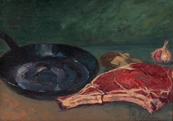 (Amorebieta, Vizcaya 1934) "Bodegón de chuleta" Firmado: J. Eguiluz Óleo / Lienzo 27 x 35 cm.; 50 x 58 cm. (con marco)