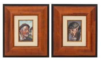 (Baracaldo, Vizcaya S. XX) "Aldeanos (pareja)" Firmado: Juanón Óleo / Tabla 16 x 11 cm. ; 40 x 35 cm. (cada uno)