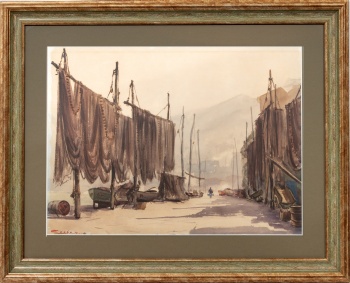 (S. XX) "Pescadores descargando en el puerto" Firmado: Cocho 64 Acuarela / Papel 48 x 64 cm.; 71 x 87 cm. (con marco)