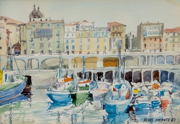 (Logroño, 1926 - 2016) "Vista de Lekeitio con barcos atracados " Firmado: Jesús Infante 87 Acuarela / Papel  24,5 x 34,5 cm. ; 43 x 53 cm. (con marco)
