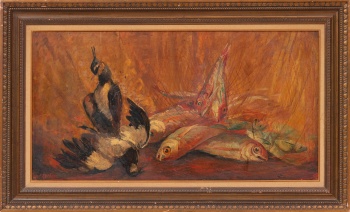 (Vitoria, Alava 1897-1969) "Bodegón de caza y pesca" Firmado: Jesús Apellaniz Óleo / Tabla 57 x 108 cm. ; 79 x 130 cm. (con marco)
