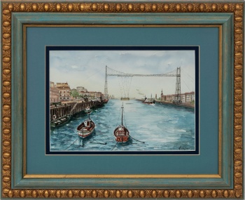 (Bilbao 1936) "Puente colgante y ría con barcos " Firmado: L. Luengo Acuarela / Papel 24 x 34 cm. ; 46 x 56 cm. (con marco)