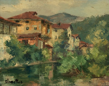 (Guernica, Vizcaya 1910 - Bilbao 1984) "Paisaje con caseríos y rio " Firmado: Olaortua Óleo / Tablex 37 x 46 cm. ; 51 x 60 cm. (con marco)