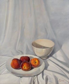 (Madrid 1948-2007) "Bodegón de cuenco y melocotones " Firmado: Marcos Óleo / Lienzo 61 x 50 cm.; 83 x 72 cm. (con marco)
