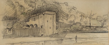 (Madrid 1867 - 1949) "Paisaje con casas y pescador " Firmado: P. Ribera Dibujo / color / papel 12 x 31 cm.; 26 x 45,5 cm. (con marco)