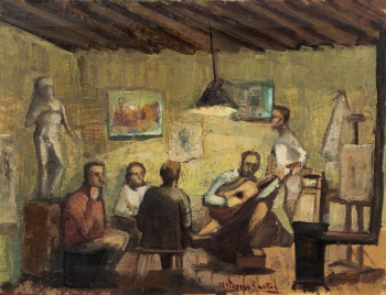 (Zamora 1932 - Madrid 2004) "Tertulia con Guitarrista en el estudio del pintor " Firmado: M. Teresa Santos Óleo / Lienzo 50 x 65 cm.