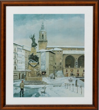 (Vitoria 1935) "Plaza de la Virgen Blanca, Vitoria " Firmado: V. Ugarte (a lapicero) Litografía / Papel Ejemplar: 310 / 500 58 x 50 cm. ; 63,5 x 56 cm. (con marco)