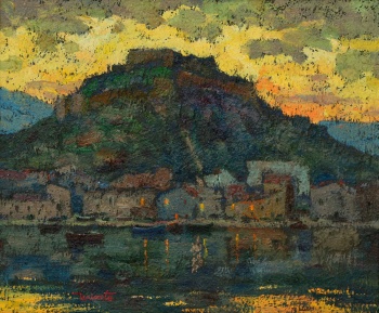 ( Amorebieta 1931) "Crepúsculo. Denia" Firmado: Uriarte Óleo / Lienzo 46 x 55 cm.; 70 x 78 cm. (con marco) Al dorso titulado y firmado.
