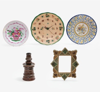 Lote compuesto por 5 piezas en cerámica policromada: candelero esmaltado marrón, portaretratos con decoración vegetal y flores, pareja de platos con decoración flores, gallo, etc. y reloj de colgar con decoración de flores y números árabes.