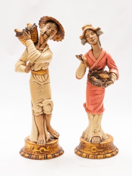 Pareja de figuras orientales en escayola policromada y dorada representando pescador y pescadora.