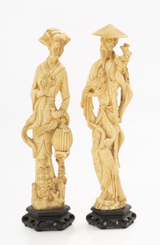 Pareja de figuras orientales en resina representando dama con pájaro, abanico y sabio con aves. Peanas en madera tallada.