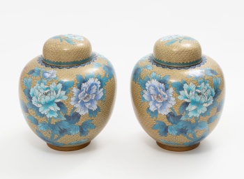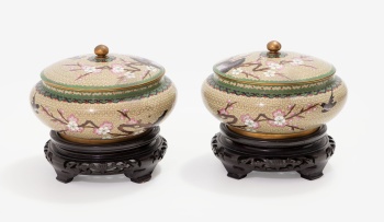 Pareja de jarrones orientales en esmalte cloisonné con decoración de flores y mariposas. Peanas en madera.