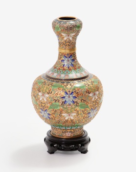 Jarrón en metal dorado y esmalte con decoración de flores y hojas. Base en madera. Estuche original.
