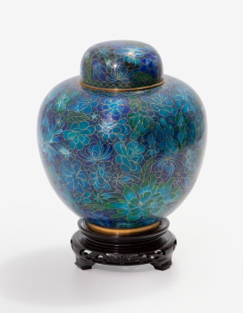 Potiche oriental en metal dorado y esmalte con decoración de flores. Base en madera.