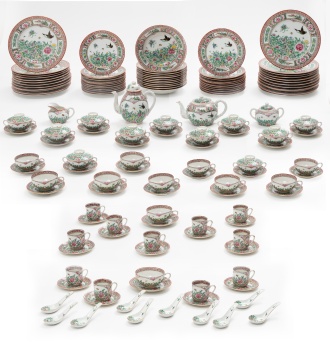 Vajilla y juego de té y café en porcelana policromada y dorada con decoración de flores, hojas, pájaros, mariposas, libélulas y greca compuesta por 109 piezas: 12 platos hondos, 24 platos llanos, 24 platos de postre, 12 tazas y platos de consomé con tapa y 10 cucharas, cafetera, tetera, azucarero, 12 tazas y platos de té y 12 tazas y platos de café. Sello en la base. Hong Kong.