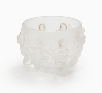 Macetero en relieve en cristal opaco representando "Querubines danzando y guirnaldas". Firmado Lalique. Francia.