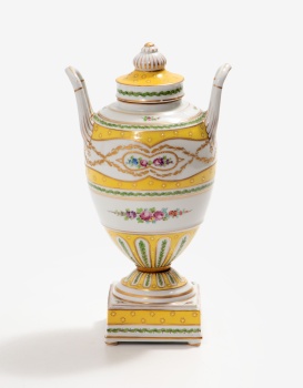 Jarrón en porcelana policromada y dorada en relieve con decoración de flores y hojas. Estilo Luis XVI. Sello en la base. Manufactura Sevres.