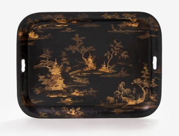 Bandeja oriental en hojalata pintada negro y dorado con decoración de paisaje con casas y árboles.