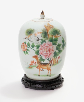 Jarrón oriental con tapa en porcelana policromada con decoración de paisaje con flores, animales y letras. Base en madera.