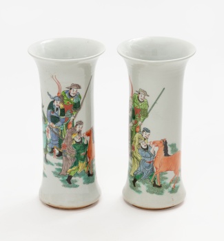 Pareja de jarrones orientales en porcelana policromada con decoración de escena de guerreros y caballo. Firmado en la base.