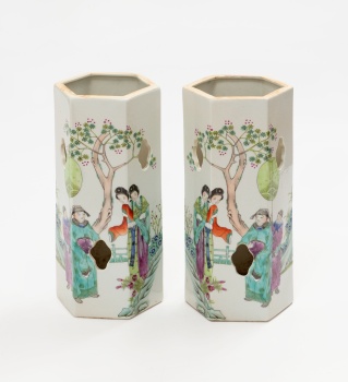 Pareja de jarrones orientales en porcelana policromada con decoración de paisaje con personajes, flores y árboles. Sello rojo en la base.