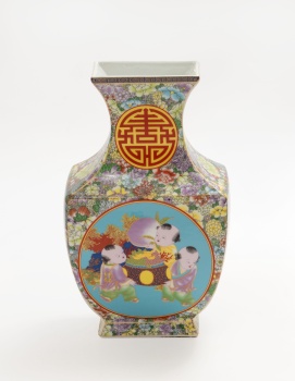 Jarrón oriental en porcelana policromada con medallón central representando niños con cesta de frutas y flores. Sello en la base.
