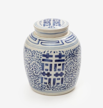 Potiche oriental en porcelana esmaltada blanca y azul con decoración vegetal y letras.
