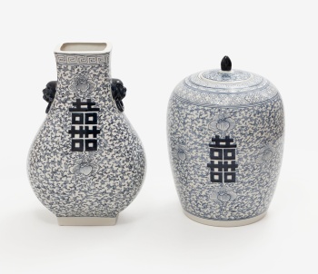 Conjunto de jarrón y potiche oriental en porcelana azul y blanca con decoración de flores, hojas, letras y asas representando cabezas de furias.