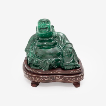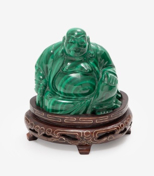 Figura en malaquita representando Buda. Base en madera con incrustaciones de metal y decoración geométrica.