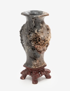 Jarrón oriental en esteatita tallado en relieve con decoración de flores, hojas y pájaro.