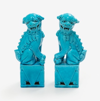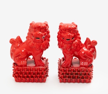 Pareja de figuras en cerámica esmaltada en rojo representando perros de Fu.