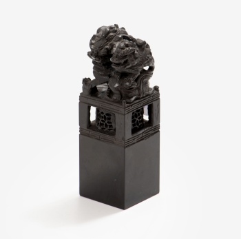 Escultura oriental en piedra dura con decoración de figuras representando perros Fu.