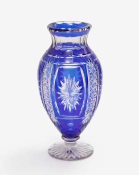 Jarrón en cristal de Bohemia tallado en tono azul con decoración geométrica y hojas.