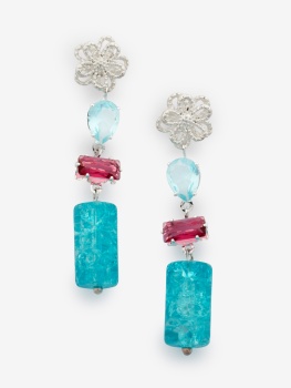 Pendientes largos en plata con forma de flor y cristales Swarovski en tonos azul y rosa, cristales Craker en color azul.
