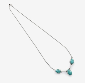 Cadena en plata y 3 piedras larimar talladas en forma de lágrima. Largura: 40 cm.