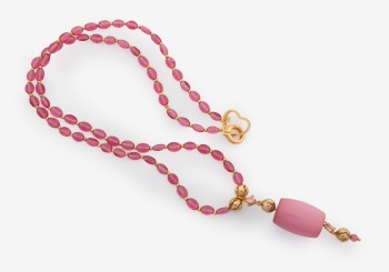 Collar largo en plata dorada, cristales rosas, cristales de Swarovski en tono rosa y colgante cristal ojo de gato en tono rosa. Largura: 63 cm.