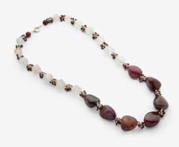 Collar largo en plata con cuarzo y piedras granates. Largura: 70 cm.