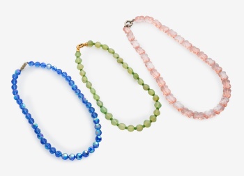 Lote compuesto por 3 gargantillas en piedras verdes y cristales facetados en color azul y rosa, cierres en plata y metal. Largura: 42 cm. (verde); 45 cm. (azul); 50 cm. (rosa)