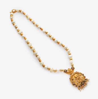 Collar largo en metal plateado, perlas barrocas y colgante con piedras de colores, representando diosa india y decoración vegetal.
