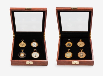 Lote compuesto por 8 relojes de bolsillo de la colección Rarezas de Época: reloj de bolsillo Misterioso, Brújula, Saboneta, Flor de Lis, etc. Certificado de autenticidad. Relojería Losada certifica las características técnicas de la colección. Edición numerada, nº 000511. Estuches en madera.