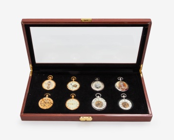 Lote compuesto por 8 relojes de bolsillo de la colección Rarezas de Época. Certificado de autenticidad. Relojería Losada certifica las características técnicas de la colección. Edición numerada, nº 000511. Estuche en madera.