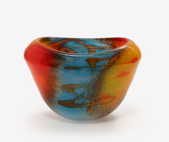 Centro en cristal soplado en tonos azules, naranjas y amarillos. Colección limitada. Firmado por artista Lituano.