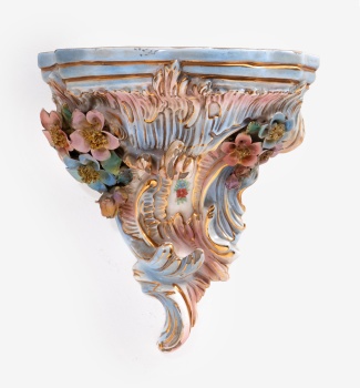 Ménsula en porcelana policromada y dorada con decoración de rocallas, flores y hojas. Estilo Luis XVI.