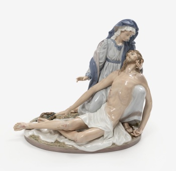 Figura en porcelana policromada representando "La Piedad". Firmada por el escultor Nurio y decorador N. Navarra. Numerada 921. Sello en la base. Manufactura Lladró. Daisa 1993.