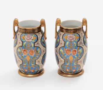 Pareja de jarrones en porcelana policromada y dorada en relieve con decoración de flores, hojas y greca.