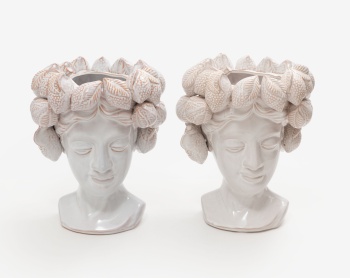 Pareja de jardineras en porcelana esmaltada en blanco representando bustos de personajes con frutas.