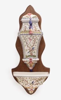 Aguamanil en cerámica policromada con decoración de flores, hojas, árboles, pájaros y figura representando pez. Base en madera. Portugal.