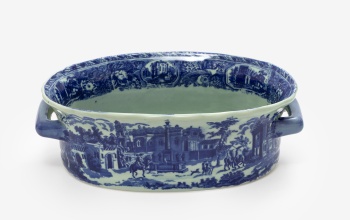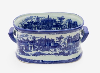 Jardinera en porcelana azul y blanca con decoración de paisaje con casas, personajes, animales, árboles y flores. Sello en la base. Manufactura Ironstone.