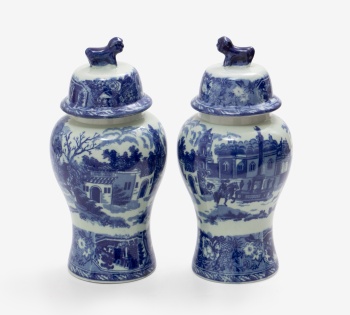 Pareja de jarrones en porcelana policromada azul y blanca con decoración de escena con personajes, caballos, casas, árboles, flores, hojas, etc. Sello en la base. Manufactura Ironstone.